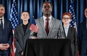Black Male Politician and Associate Shaking Hands in front of Flashing Cameras